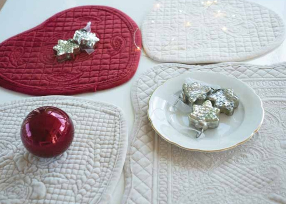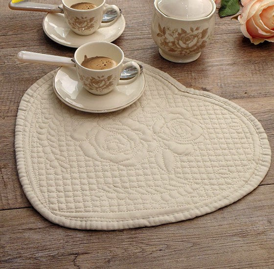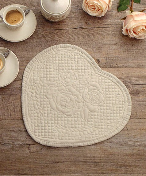 Centrino o tovaglietta in velluto trapuntato colore avorio a forma di cuore.
