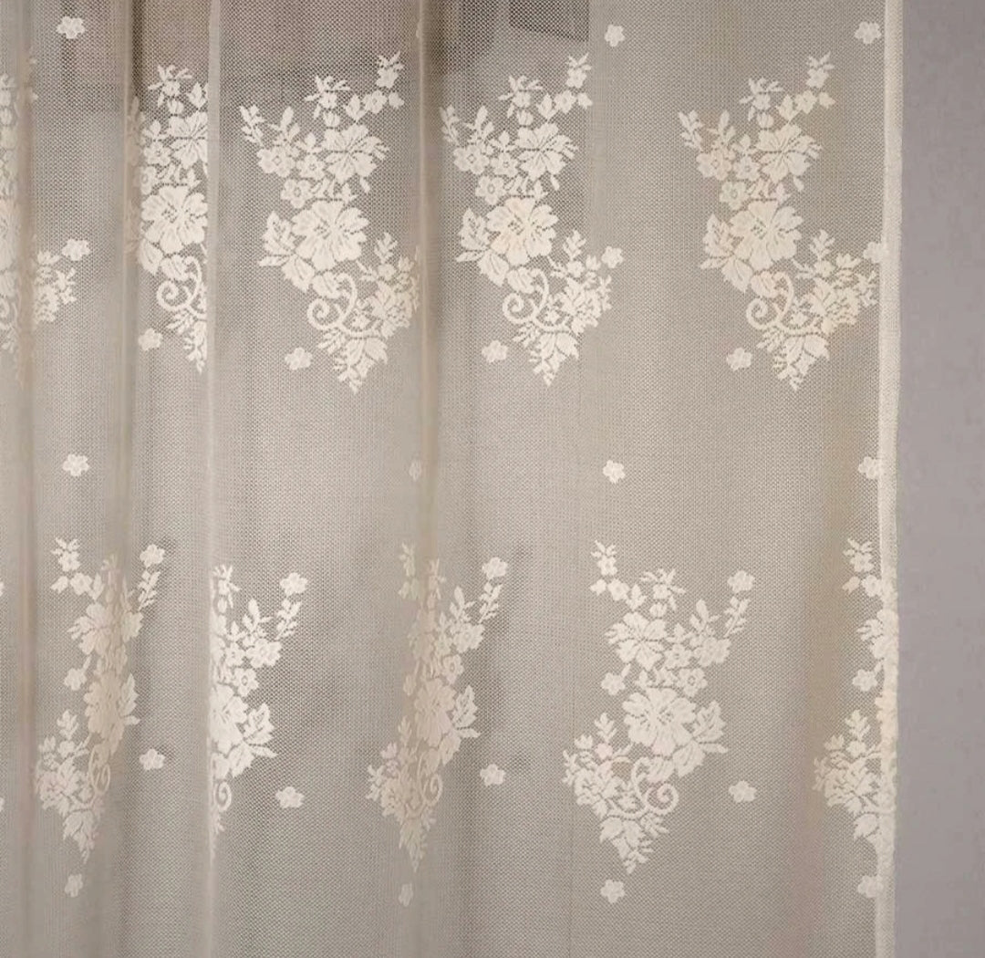 La tenda ha una trama tulle con ricamo floreale romantico e shabby chic.