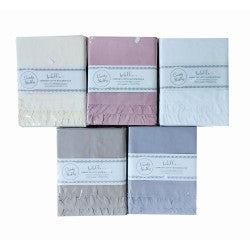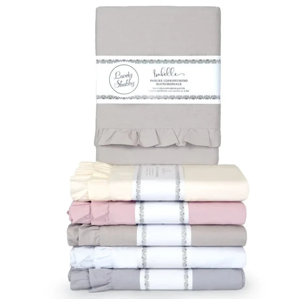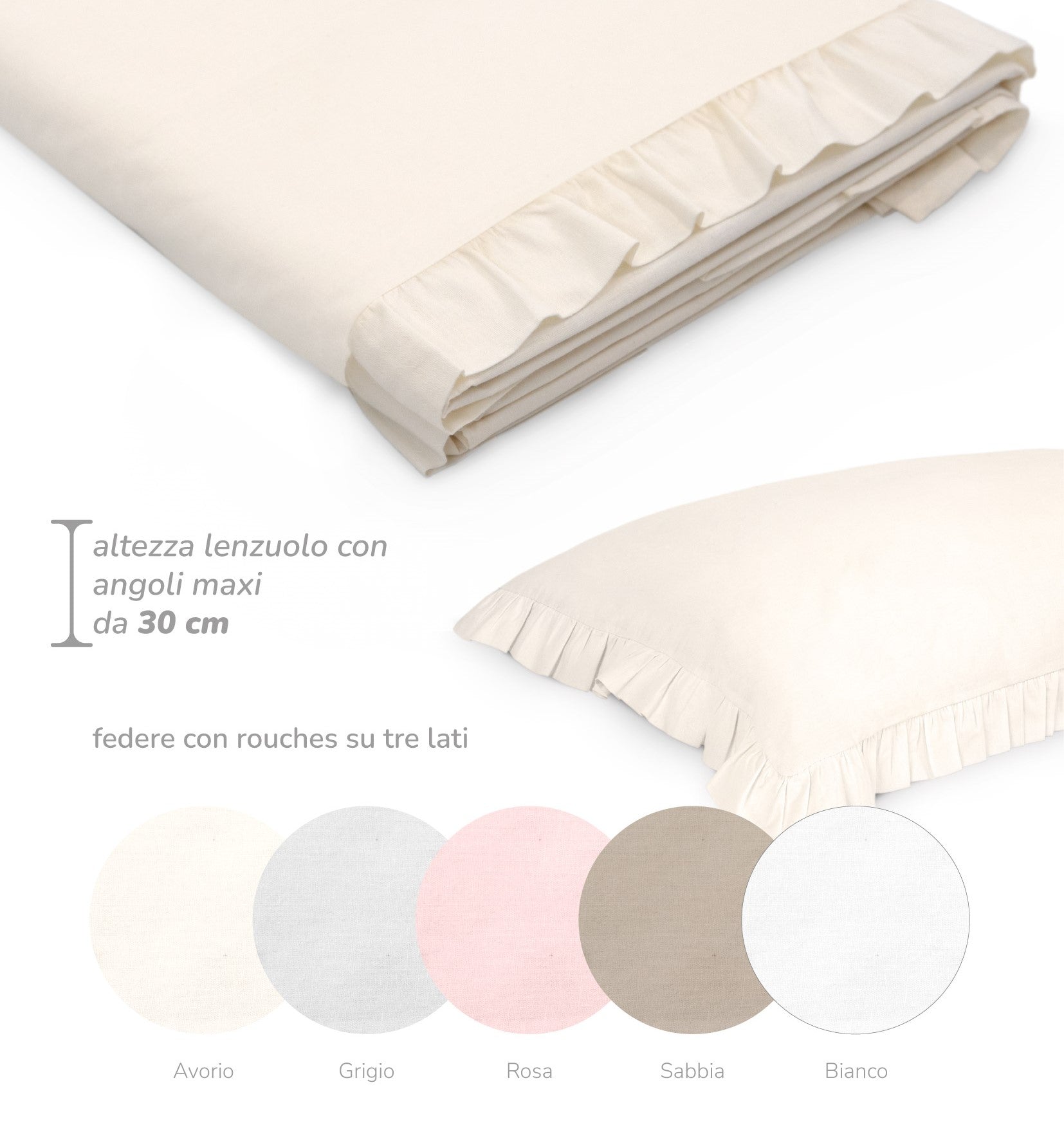 Elegante completo di lenzuola matrimoniali con rouche interamente realizzato in tessuto di puro cotone e comprende: