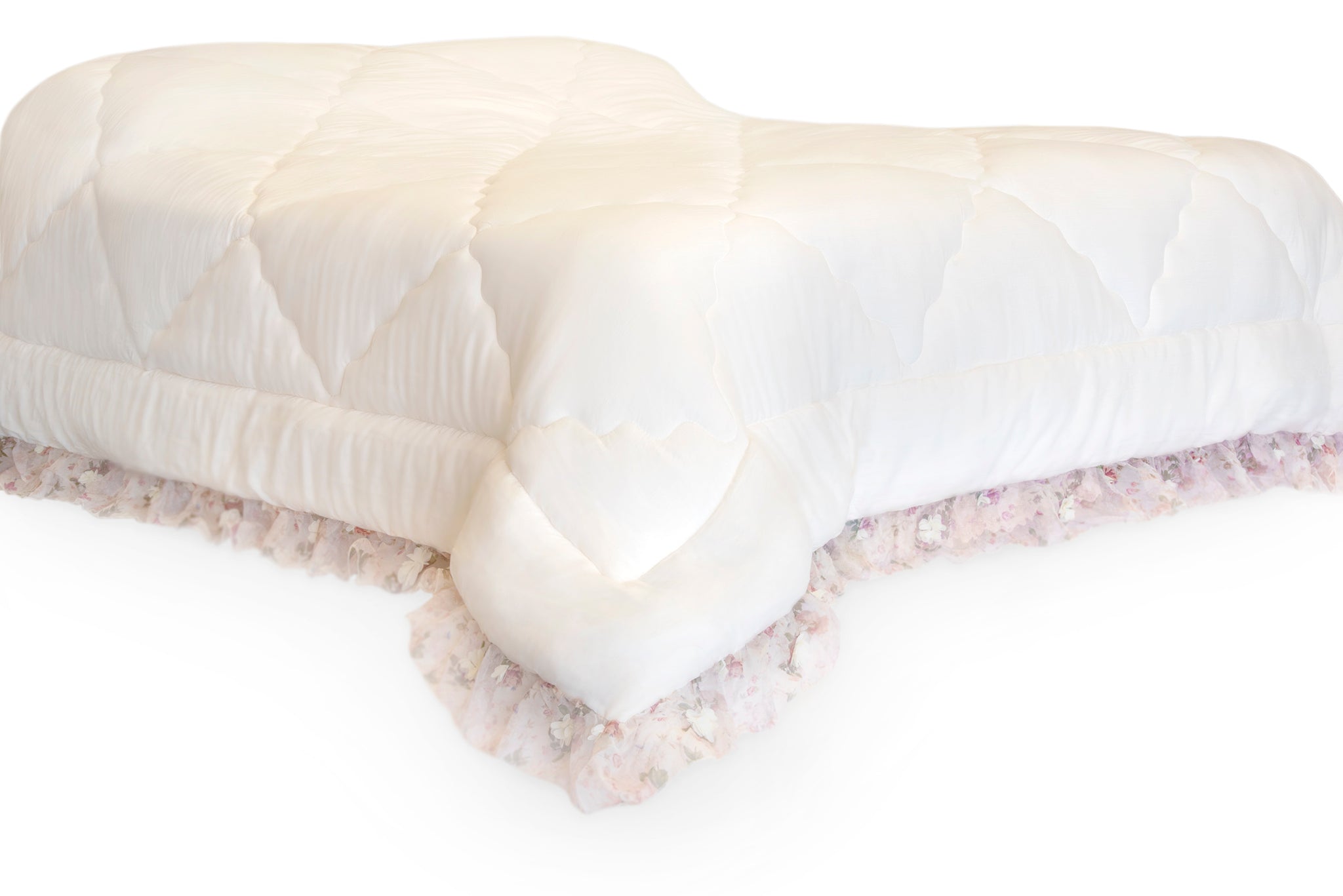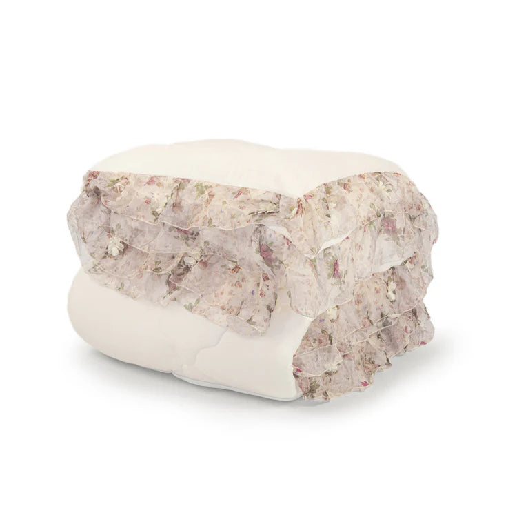 La trapunta è arricchita da un volant in organza con una delicata stampa floreale sui tre lati.